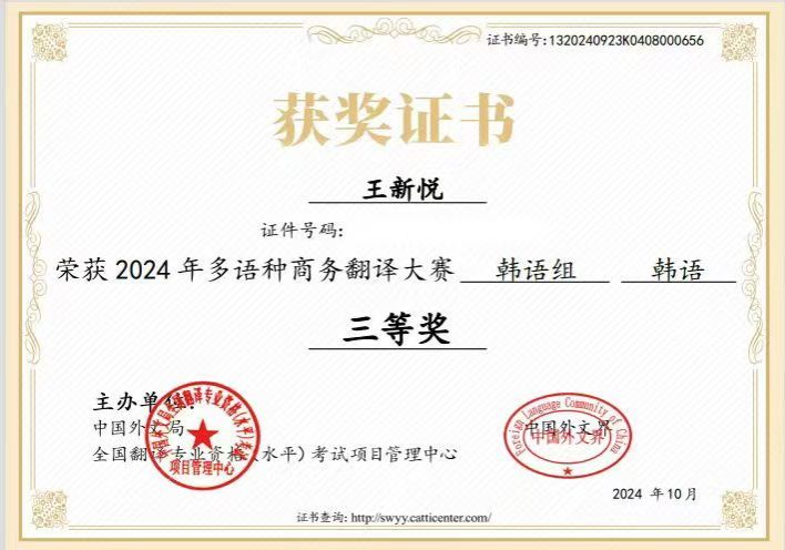 2024年9月28日至9月29日,由中国外文局和全国翻译专业资格水平考试项目管理中心联合主办了2024年全国多语种商务翻译大赛,我校朝鲜语专业2201班的王新悦同学在此次大赛...