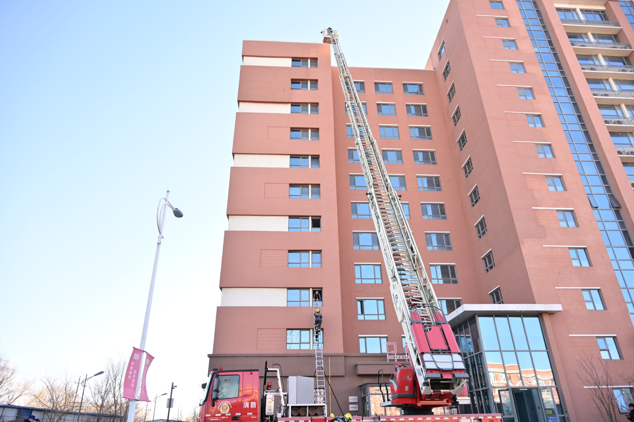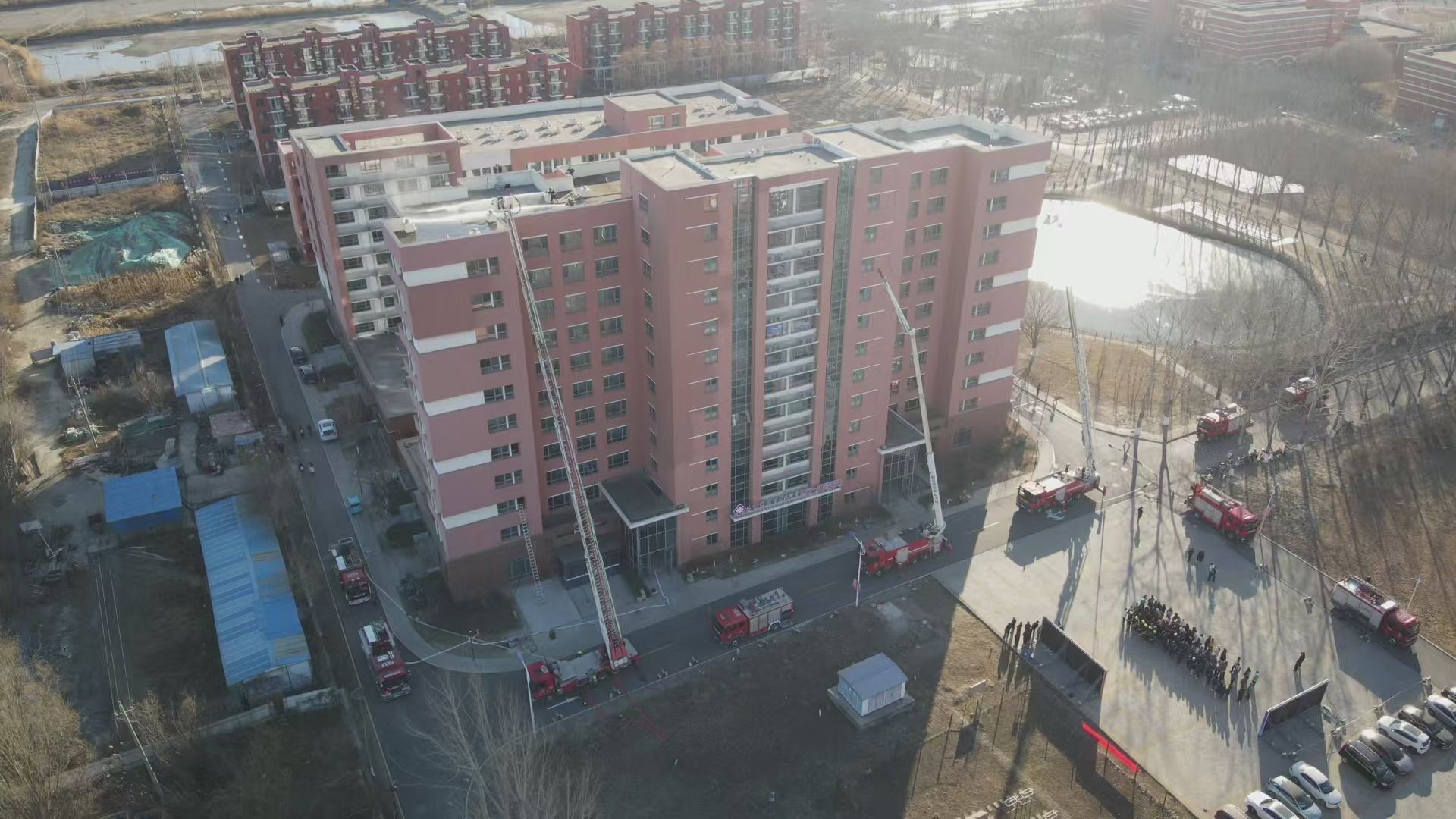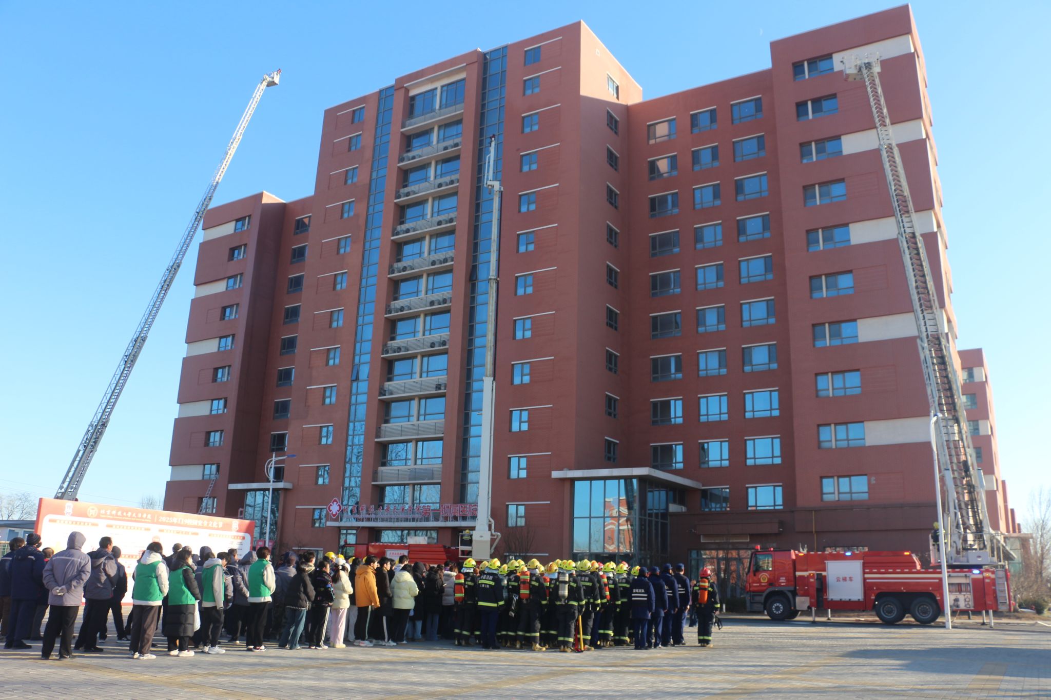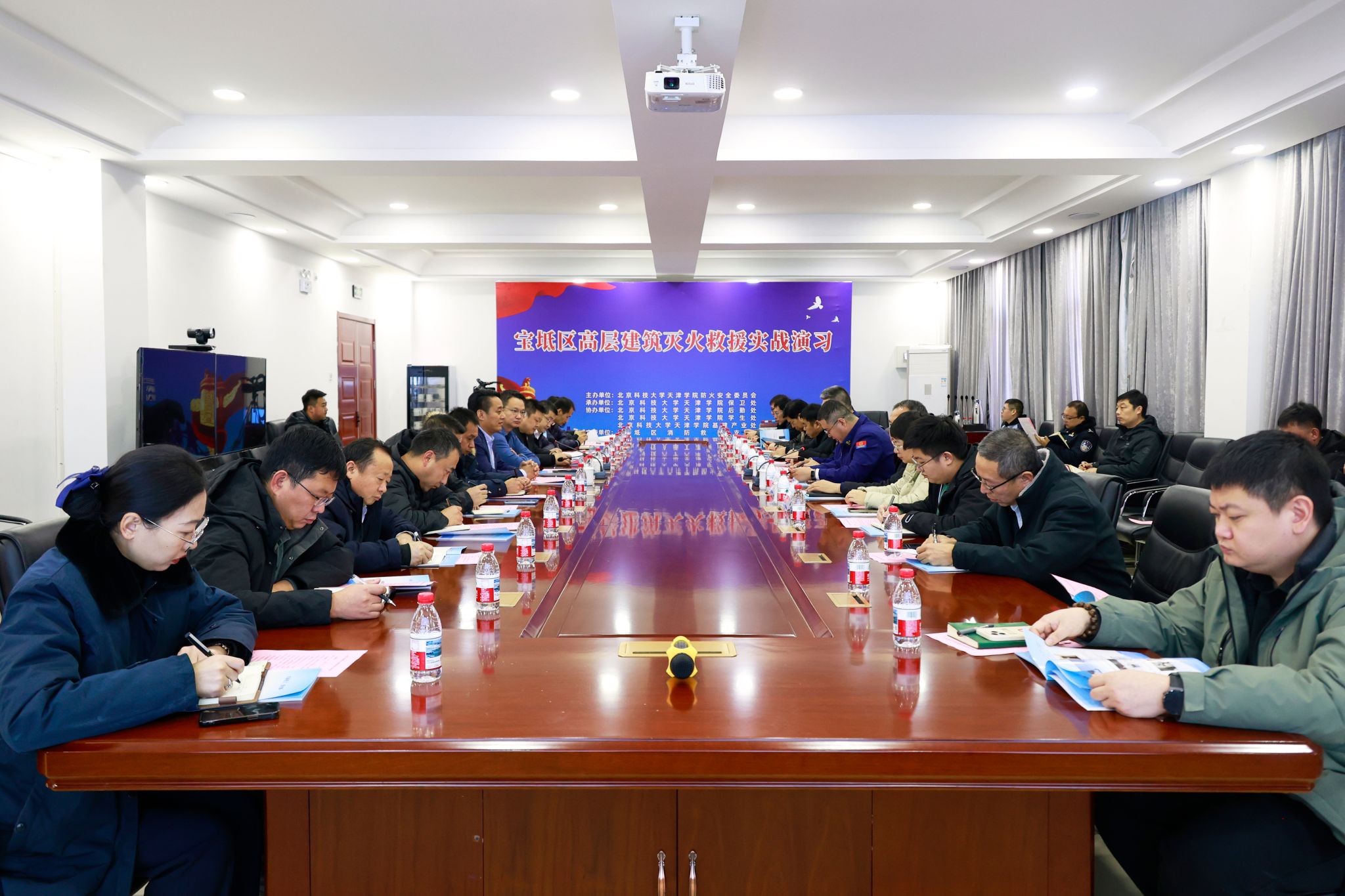 为深入贯彻落实习近平总书记关于统筹发展和安全的重要论述,健全多方协同联动机制,切实筑牢消防安全防线,12月25日下午2:30,宝坻区高层建筑灭火救援实战演习在学院成功举办。本次活动以11层高层公寓为演习现场,与会领导在学院12教300会议室同步观看演习直播并讲话。宝坻区消防救援支队支队长王西刚、副支队长王晓泽,学院党委书记叶振楠、副院长张永锋,区应急局、商务局、住建委、卫健委分管领导及36个高层单位管理人共同参与活动。