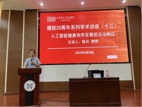 2025年5月28日15时,建院20周年系列学术讲座第十三讲在理工馆学术报告厅成功举办。南开大学法学院副院长陈兵教授为师生们带来了一场以“人工智能健康有序发展的法治响应”为主题的精彩讲座。此次讲座由法律系系主任朱京安教授主持,法律系部分教师及150余名学生参加了本次活动。
