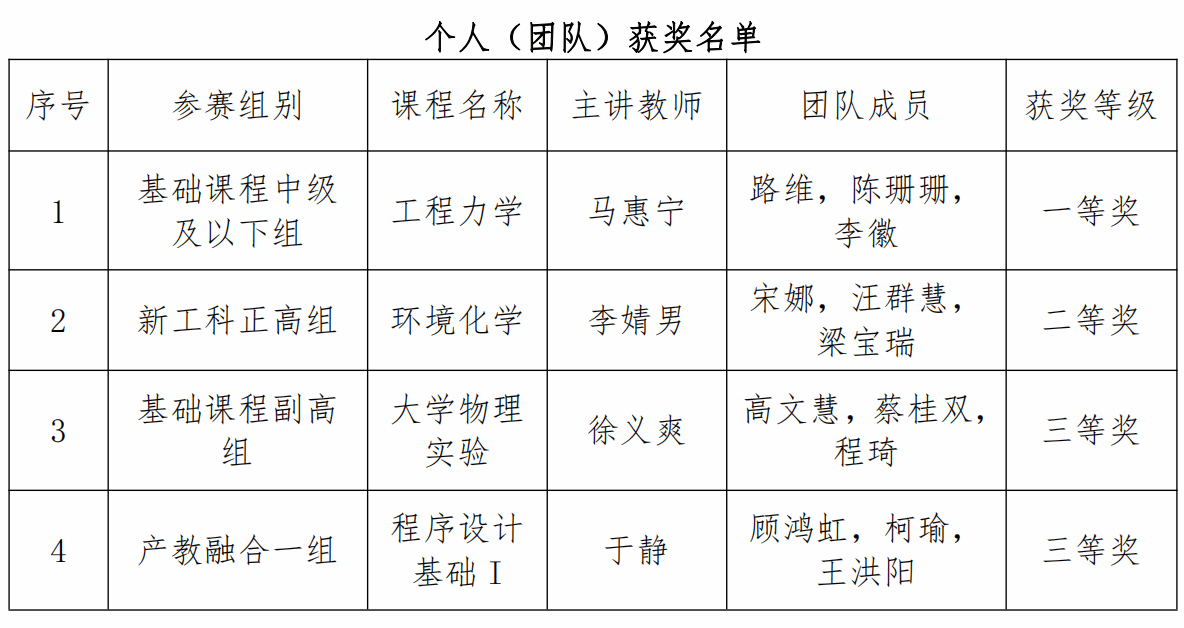 在获奖等级和获奖数量上均取得新突破,共获一等奖1名、二等奖1名、三等奖2名,在同类高校中名列前茅。其中:基础部教师马惠宁领衔的《工程力学》课程团队荣获“基础课程中级及以下组”一等奖;材料与环境学院教师李婧男领衔的《环境化学》课程团队荣获“新工科正高组”二等奖;实验室管理中心教师徐义爽领衔的《大学物理实验》课程团队荣获“基础课程副高组”三等奖;信息工程学院教师于静领衔的《程序设计基础I》荣获“产教融合一组”三等奖。