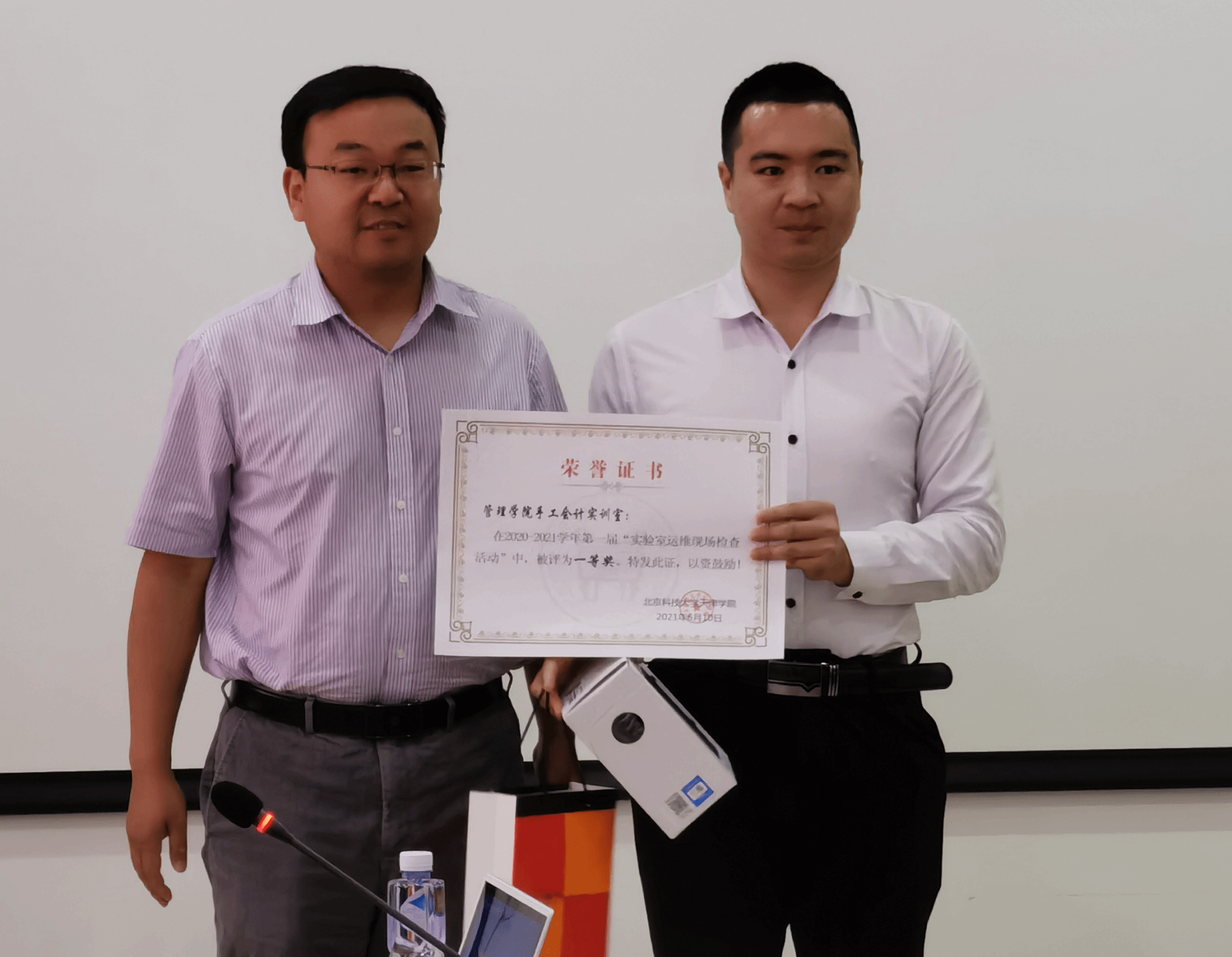 此次运维检查活动颁奖仪式于6月10日上午10点在12教300会议室举行,运行维护科科长王伟冬主持颁奖仪式,由党委副书记牛犁、教务长张建华、实验室管理中心主任陈宝江、实验室管理中心副主任张利依次颁发一等奖、二等奖、三等奖并合影留念。