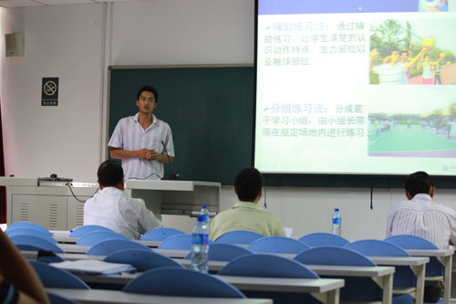 体育部特别成立了基本功大赛参赛指导小组。指导小组根据历次说课活动中教师说课的情况以及专项综合素质考核,最终决定选派李杰、陈斌参加比赛。参赛指导小组按照相关文件要求有针对性地对参赛教师进行课件制作指导及体能和基本技能的培训。