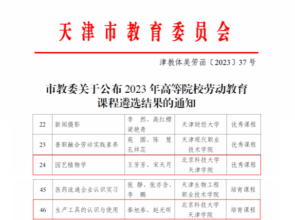 近日,天津市教委公布了2023年高等院校劳动教育课程遴选结果,老王论坛 劳动学院王芳芳、宋天月教学团队讲授的《园艺植物学》被评...