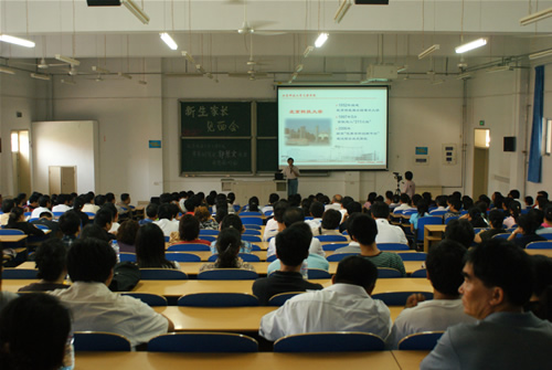 常务副院长郭景文教授向08级新生家长介绍学院情况并回答问题。新生家长热情高涨,能容纳350余人的教室座无虚席。