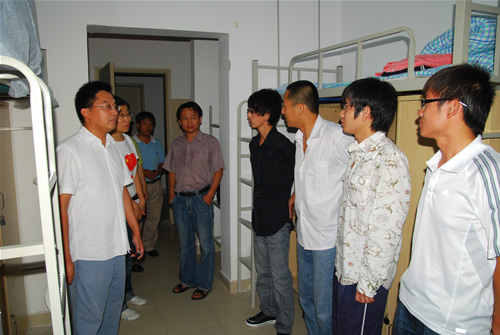 领导赴新生宿舍楼看望新生。常务副院长郭景文教授、党委书记、副院长王斌教授、副院长曹连东、财务总监肖祖刚、实验技术中心主任、信息工程系主任许学东、学院办公室主任李帅、学生处处长盛佳伟、基建后勤处处长王兴元、财务处处长王俊敏、教务处副处长吴平及各系党总支书记冒着小雨,分成四组看望了新生。