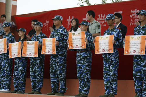 军训结业评比获奖方阵代表上台领取奖状