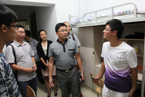 9月3日晚,院长郭景文、党委书记王斌、副院长曹连东、财务总监王合军、党委副书记盛佳伟在相关职能部门负责人的陪同下走访了新生宿舍,了解他们入学以来的生活、学习情况。