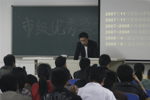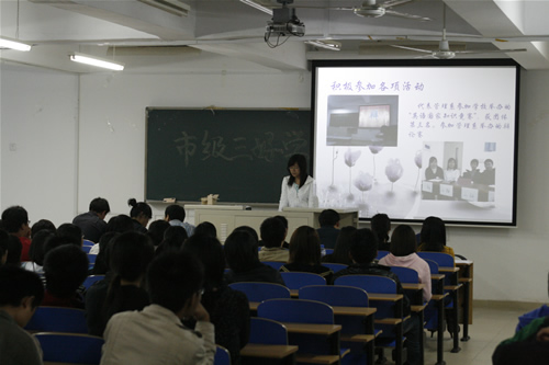 2007-2008学年度市级先进集体、三好学生和优秀学生干部答辩会在8教学楼101、102、103教室隆重举行。来自05、06、07级共11个班集体和21个个人参加了本次答辩会,各系党总支书记和辅导员代表担任评委。