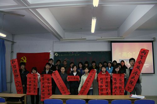 “一言一语颂两会”是本次支部活动的高潮部分,四个党小组的学生党员们用别出心裁的方式表达了对两会精神的解读。第一党小组的傅虹、彭丹阳和平京三位同学以诗朗诵《我亲爱的祖国》表达了对祖国深深的爱,字里行间洋溢着对祖国的深深祝福。第二党小组的于钰同学采用诙谐幽默的“漫画话两会”,用漫画的语言诉说着“乘两会春风科学发展铸和谐”的铿锵之音。第三、四党小组的组长李慰和柯子君则结合两会委员对社会热点问题诸如建立居民“一站式”缴费制、节能环保等提案发表了看法。