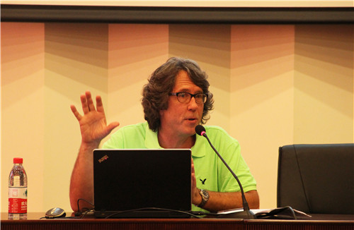 在讲座中,大卫·帕格尔(David Pagel)教授简短介绍了波普艺术对美国近代艺术的影响,用了98张具有点代表性质艺术作品为师生详细讲解了美国近代艺术的变化。易凯教授则从价值观、全球化的现实要求及个人的适应等方面介绍了美国艺术教育的特点,并且以自身的留学、生活经历为例,鼓励大家走到外面的世界去开阔眼界。讲座结束后,两位教授与学生们了做了简短的互动。