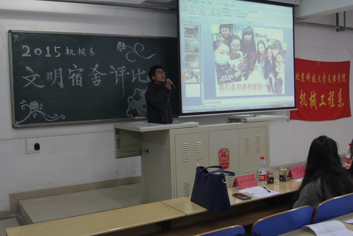 活动一开始,主持人介绍了此次文明宿舍评比活动是在系领导的指导下,经过系学生会生活部检查、统计之后,从15级机械系的宿舍中选出了9个优秀宿舍进行本次评比。