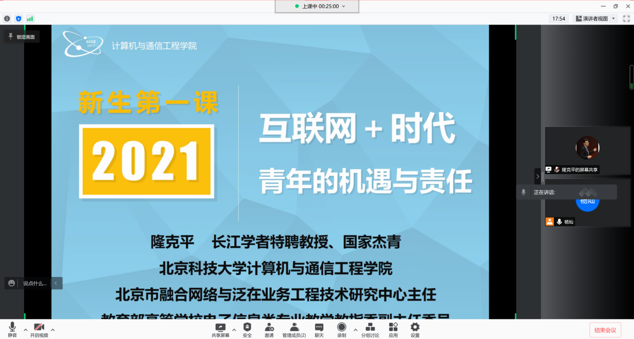计算机与通信工程学院院长、教授、博士生导师隆克平教授给21级做新生教育讲座,此次讲座采用线上形式组织,信息工程学院院长许学东,信息学院21级新生597人参加此次讲座,此次讲座由信息学院办公室主任杨灿主持。