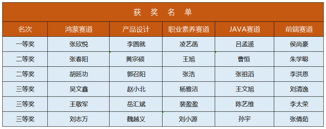 “中软杯”技能大赛共有鸿蒙赛道、产品设计赛道、职业素养赛道、JAVA赛道、前端赛道等5大赛道,本次共评出一等奖5项、二等奖10项、三等奖15项。