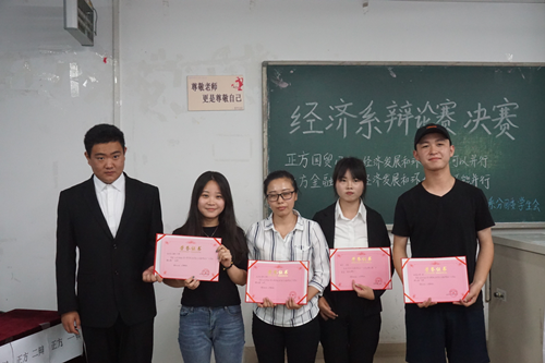 此次决赛在金融1701班和国贸1703班两队之间展开。在双方简洁的自我介绍后,比赛正式开始。正方国贸1703班认为“经济发展与环境保护可以并行”而反方金融1701班则坚持“经济发展与环境保护不可并行”的观点。双方辩手在立论,攻辩,驳立论,自由辩论,总结陈词的环节中思路清晰,引经据典,字字珠玑,使现场气氛迅速升温,在自由辩论的环节中双方选手就辩题展开更深层次的辩论,个个妙语连珠,舌战莲花的辩论一次次将比赛推向高潮。最终2018年经济系辩论赛的冠军为金融工程1701班,亚军为国贸1703班,季军为国贸1701班。