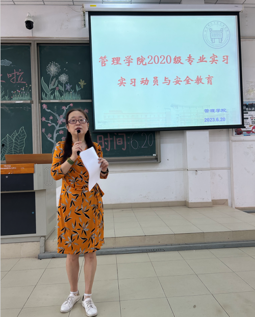 在2020级同学专业实习的动员会上,管理学院王晓欣、任洁老师分别给同学们做了关于实习任务及注意事项、实习安全等方面的讲解及动员。最后王宾容副院长做了实习动员总结,并强调了分散实习中的安全注意事项。