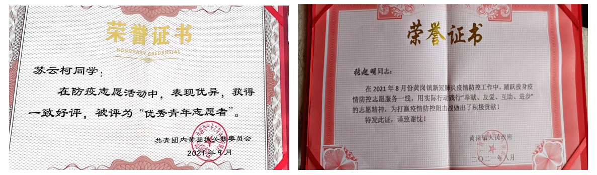 邵俊茹、张可可、苏云柯、张起明、范伊静、李滢欣、邢婧华、王双慧、黄晨琳,一个个名字跃然出现在各种感谢信和志愿者证书上,这些“功勋章”不仅深切体现了他们的优良品质和担当作为的精神风貌,更蕴含着他们背后的默默付出和诠释青年学子责任与使命的实际行动。交通卡口执勤、核酸检测登记、防疫知识宣传、消杀重点场所、入户排查实名登记、为居家隔离人员上门服务,他们在炎炎夏日,不畏酷暑,迎难而上,积极投入抗疫一线工作,主动承担起防疫工作中“守门员”、“宣传员”、“战斗员”、“保障员”的角色,尽自己所能共同筑起阻击新冠疫情的重要防线。