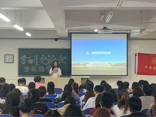 17级拟被录取到中北大学(硕士)的王仪来、河南大学(硕士)刘珊珊、天津外国语大学(硕士)的李爽。三位学生分别与18、19级同学分享了考研过程中如何积极有效地备考,如何选取适合自己的考研材料,以及英语专业考研方向进行了细致的分析。会上的交流互动更是激发同学们的学习热情和考研激情,同学们能够对本专业考研形势有进一步的了解,学姐们同时也对备考过程中遇到的问题作出解答,能增强学生信心,使准备考研的学生对考研有了更深的了解。