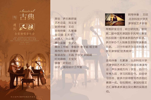 艺术系弘艺音乐厅,成功举办了由艺术系声乐教师刘义宝指导策划的“当古典遇到民谣——全莹独唱音乐会”刘义宝声乐教学实践系列音乐会(二)。本场音乐会由刘义宝老师担任艺术总监和指导教师,钢琴教研室主任王欣老师担任钢琴伴奏,2015级学生孔繁康担任吉他伴奏,王天宇担任鼓手,2014级学生孙正勇担任主持人。