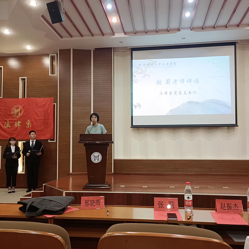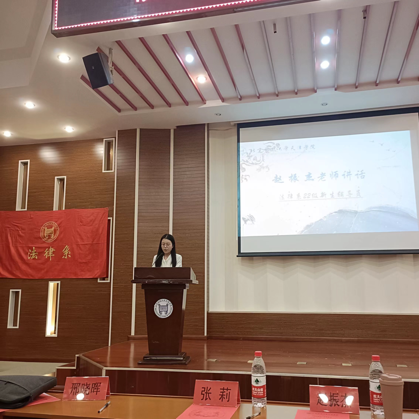法律系党总支书记张莉老师以提问的方式表明确定目标的重要性,并表示教学是双向的过程,通过自己多年的教学经验对法律系2022级新生提出勤学、笃思、力行、明志四点期望。