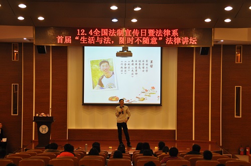 为弘扬宪法精神,加深同学们对法律知识的了解,体会法律的重要性,法律系分团委、学生会以“全国法制宣传日”为契机,于12月4日下午15:30在理工馆学术报告厅举办的首届“生活与法,随时不随意”法律讲坛。