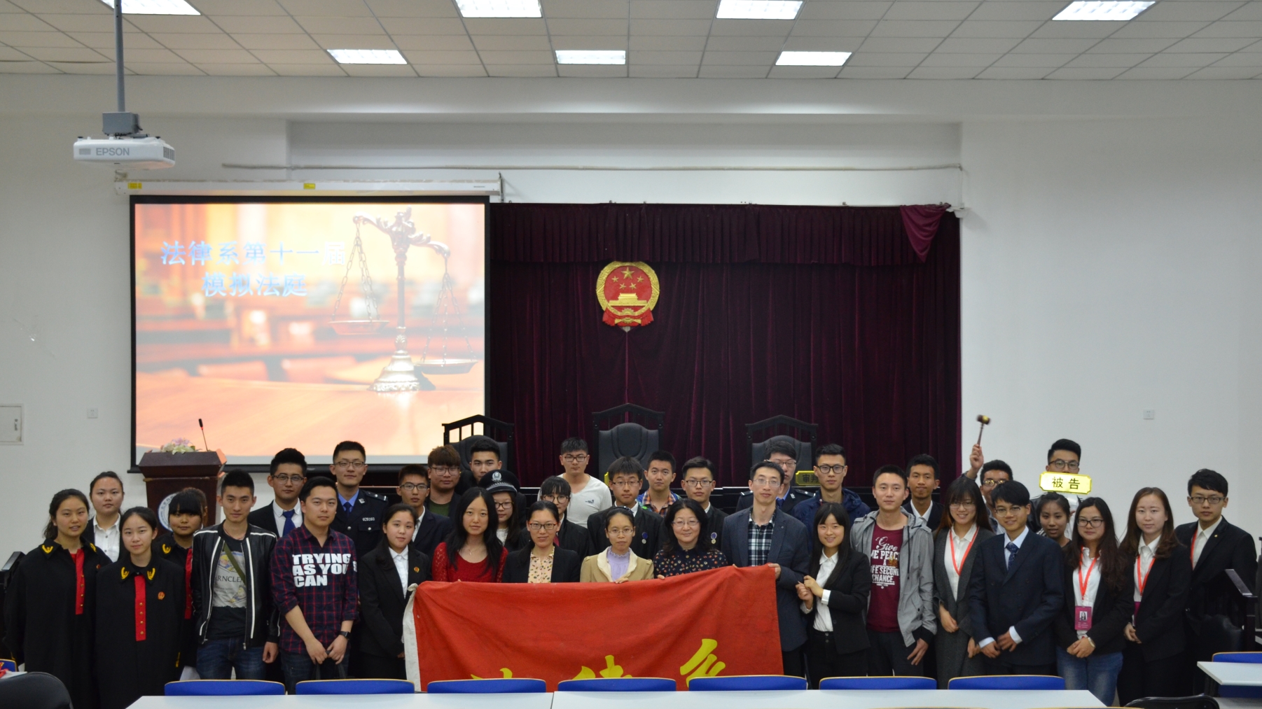 4月28日晚18:30,由法律系分团委、学生会主办的第十一届模拟法庭在8-109正式开庭。法律系党总支书记冯海燕,分团委书记闫谡,老师刘志苏、王哲老师、陈慧,导员孙超、朱嘉阳、王志润出席了本次活动。