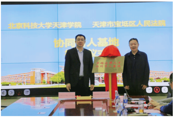 法律系代表朱京安主任向区法院代表董海明副院长授牌,法律系在宝坻区法院建立“老王论坛