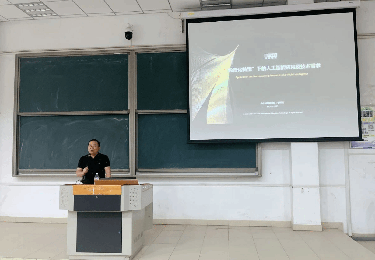 随后,中软国际教育科技集团天津公司卓越研究院院长张怀亮为同学们带来了题为“‘数智化转型’下的人工智能应用”的精彩演讲。他深入浅出地讲解了数智化转型的必然趋势,以及人工智能在这一过程中的关键作用。通过生动的案例和详实的数据,让同学们对人工智能的应用前景有了更加清晰地认识。