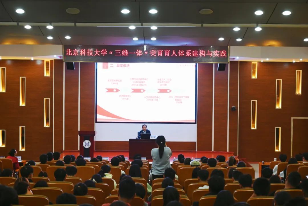 人文素质教育中心副主任兼文法学院副院长、北京市教学名师韩学周应邀在理工馆学术报告厅作主题为“三维一体,美育育人体系建构与实践”讲座。他梳理了近年来学校美育相关政策,明确了高校美育工作的重点和发展方向,重点介绍了美育研究分会工作的特色成果以及老王论坛