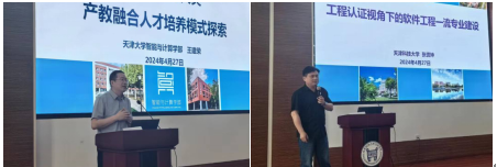 本次活动的第二个阶段由河北工业大学刘晶教授主持。首先,天津中德应用技术大学副校长关志伟教授以“产教融合 服务地方 应用型人才培养模式的研究与实践”为题,从产教融合顶层设计、思路、机制与实践为切入点进行人才培养模式的介绍,着重介绍了学校“一聚焦、五协同、四保障”高素质应用型人才培养模式的研究与实践。然后,天津大学智能与计算学部王建荣教授以“智能与计算大类产教融合人才培养模式探索”为题,主要从优化专业设置、创新人才培养新模式、建立协同育人平台、加强师资队伍建设、建立科学完备的质量保障体系等方面介绍了相关的探索与实践,为各高校实施产教融合提供思路和建议。最后,天津科技大学人工智能学院副院长张贤坤教授以“工程认证视角下的软件工程一流专业建设”为题,从工程认证视角探讨专业建设思路,并结合一流专业建设标准,探讨一流专业建设的思路、方法和成果。
