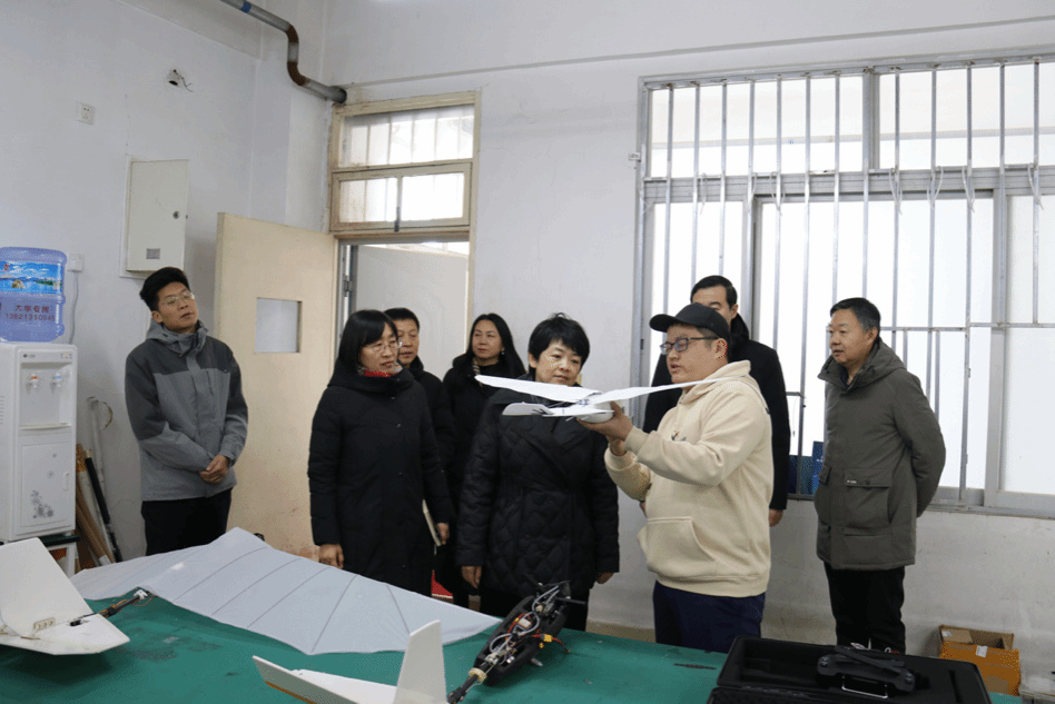 无人机展厅,现场观摩了无人机飞行演练,参观了艺术设计系非遗传承工作室教学成果展,对学院专业建设、人才培养成果及对宝坻区文旅工作所做的贡献给予充分肯定。
