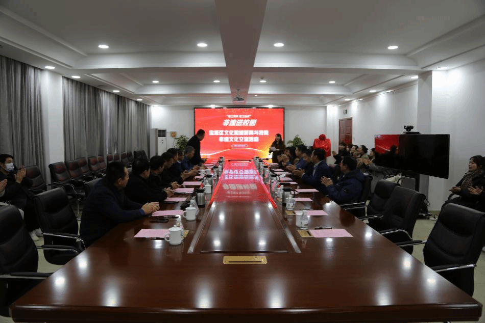非遗文化交流活动在300会议室举行。宝坻区文化旅游局副局长张英、宝坻区文化旅游局三级高级主办阮洪臣,宝坻区文化旅游局非遗科科长张宝政,非遗传承人李绍晨、辛宇伶、王金啟、谢学华、刘宝明、杨洪顺,学院院长丁煦生,党委书记叶振楠,副院长张永锋,副院长兼财务总监王俊敏,院长助理、学术委员会主席宋存义,艺术学院院长胡宝嘉、艺术设计系常务副主任李文红及宝坻区文化遗产科全体成员、学院师生代表参加本次活动。