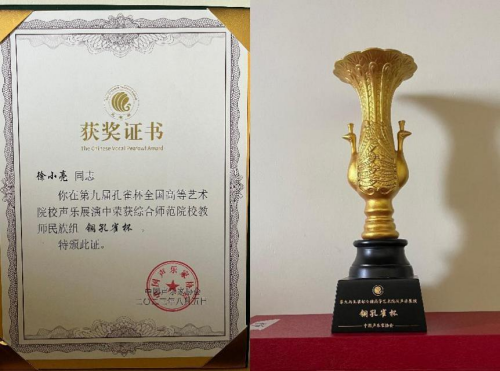 11名师生进入复赛,经过两轮展演、总展演的复赛激烈角逐,艺术学院音乐系青年教师徐小亮获得综合师范院校教师民族组铜孔雀奖,青年教师白晶袁获得综合师范院校教师美声组优秀奖,教师徐小亮指导的2021级学生荀子弋获得综合师范院校本科民族组优秀奖,其他师生获得共8项展演奖。艺术学院音乐系荣获第九届孔雀杯高等艺术院校声乐展演“优秀组织奖”。