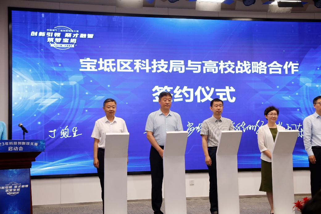 6月15日上午,宝坻区第七届创新创业大赛暨2023年科技创新攻关赛启动会在京津中关村科技城举行。宝坻区委区政府、北京市通州区科学技术委员会、河北省唐山市科学技术局、宝坻区工业和信息化局、共青团宝坻区委员会、天津市智能网联汽车人才创新创业联盟,以及天津大学、天津工业大学等单位领导和专家学者现场出席活动,学院院长丁煦生受邀参加活动,与区科技局签署政校合作协议并作为高校代表发言。