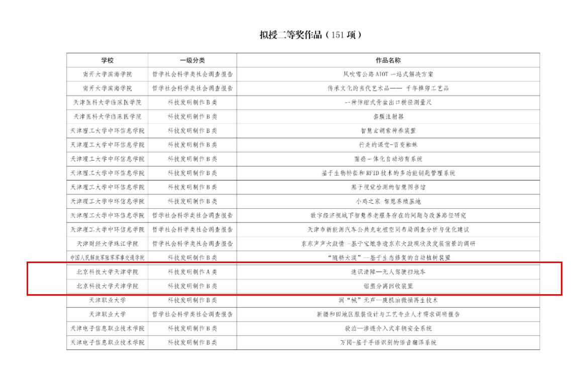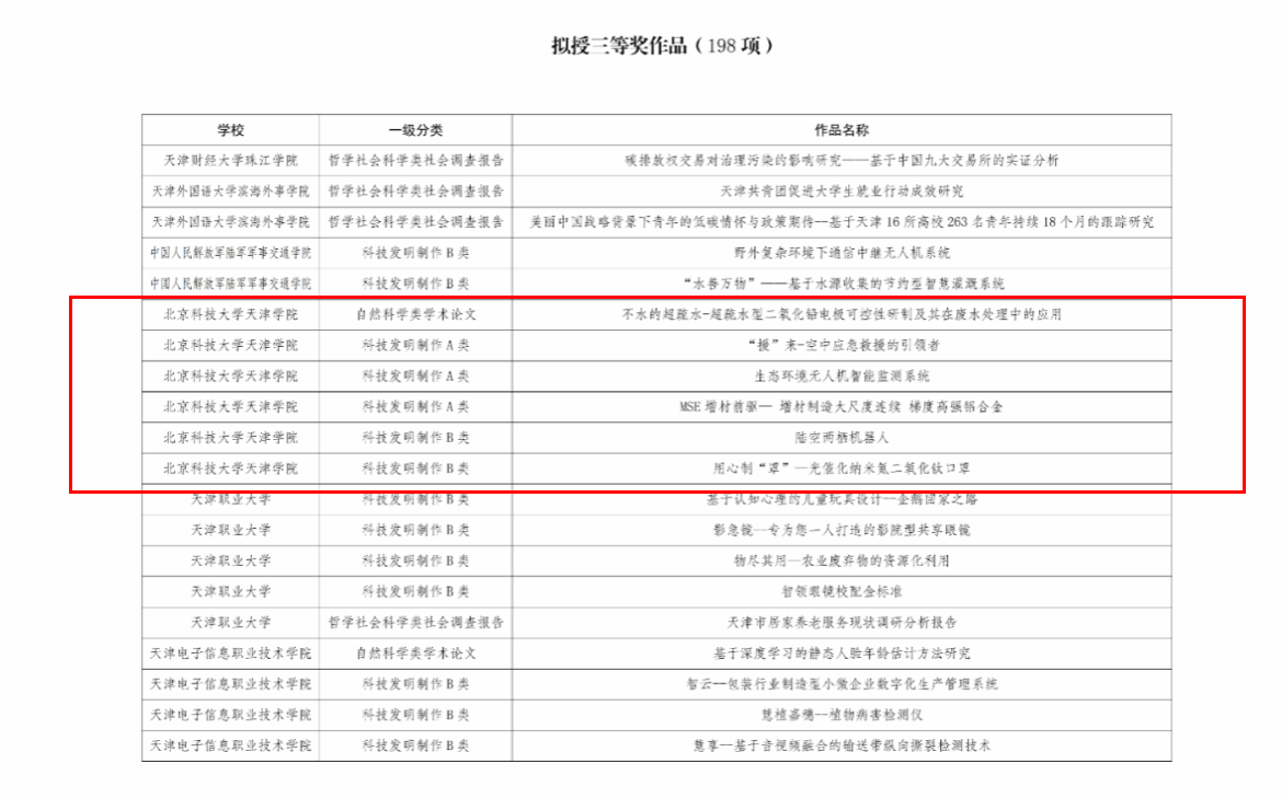 近日,由团市委、市教育两委、市科技局、市科协、天津社科院、市社科联、市学联主办的第十七届“挑战杯”中国银行天津市大学生课外学术科技作品竞赛圆满收官。本届“挑战杯”竞赛我校共十一个作品参赛,最终共有1项获得市级特等奖,2项获得市级二等奖,6项获得市级三等奖,获得历史最好成绩!