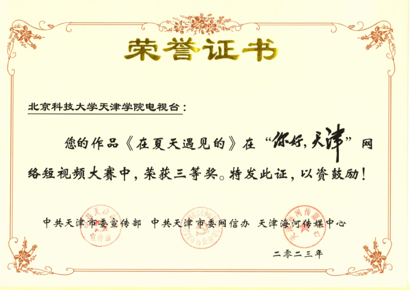 电视台《在夏天遇见的》、《小贝壳们在全国各地为天津加油》、《结业典礼正版来啦》3部作品经过激烈的角逐和比拼,突出重围,在本届“你好,天津”短视频年度总决赛荣获三等奖佳绩!