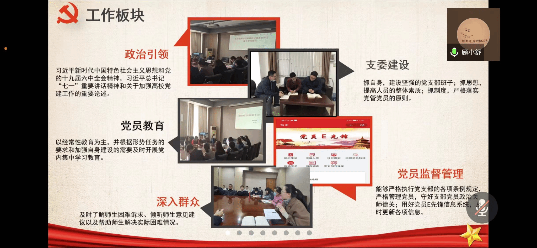 党委书记丁煦生同志在总结讲话中提到,各支部的特色要继续保持发扬,要持续提升党员教育和管理的能力,严格把控党员质量。同时,要求各党支部不断增强基层党组织凝聚力和战斗力,持续提升党支部工作质量,推动党支部规范化建设工作稳步前进,切实落实好基层党组织建设的各项任务和要求,多向优秀的支部学习吸纳经验,相互学习合作,共同进步,形成推动学院基层党建工作更快、更好发展的强大合力。