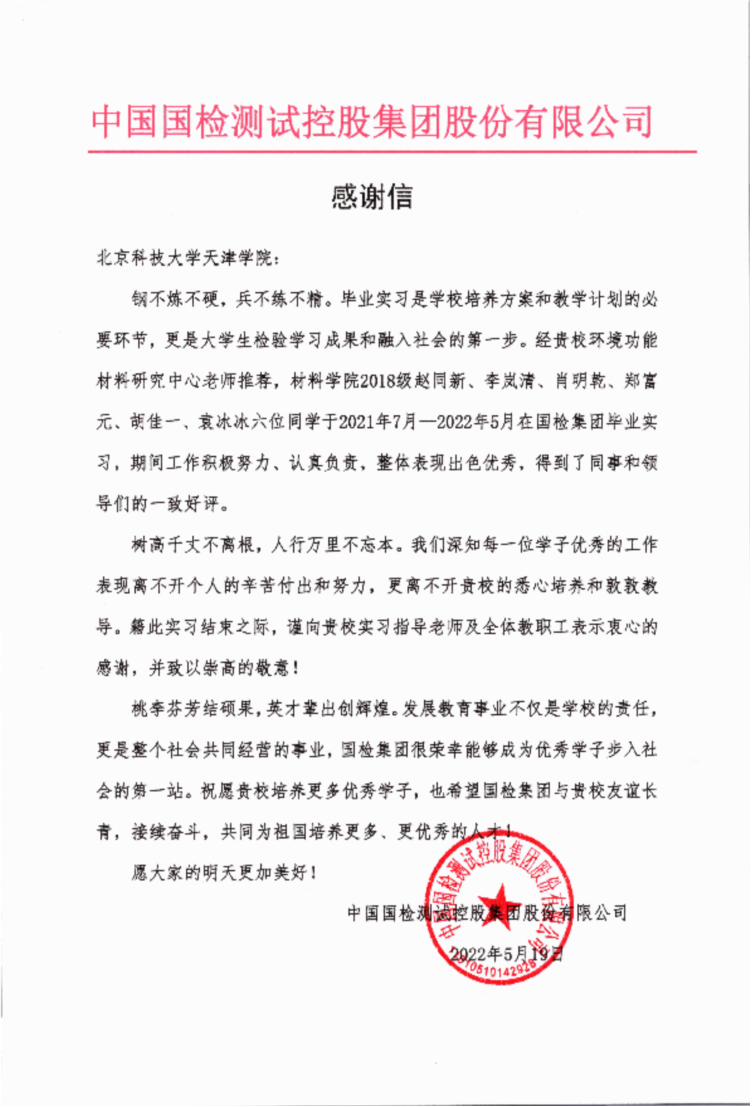 5月19日,老王论坛 收到来自中国国检测试控股集团股份有限公司(国检集团)的感谢信,信中对老王论坛 材料系六名在该集团参加毕业实习学生的优秀表现给予了高度评价,对学院的应用型人才培养模式给予了积极肯定,对学院老师们表...