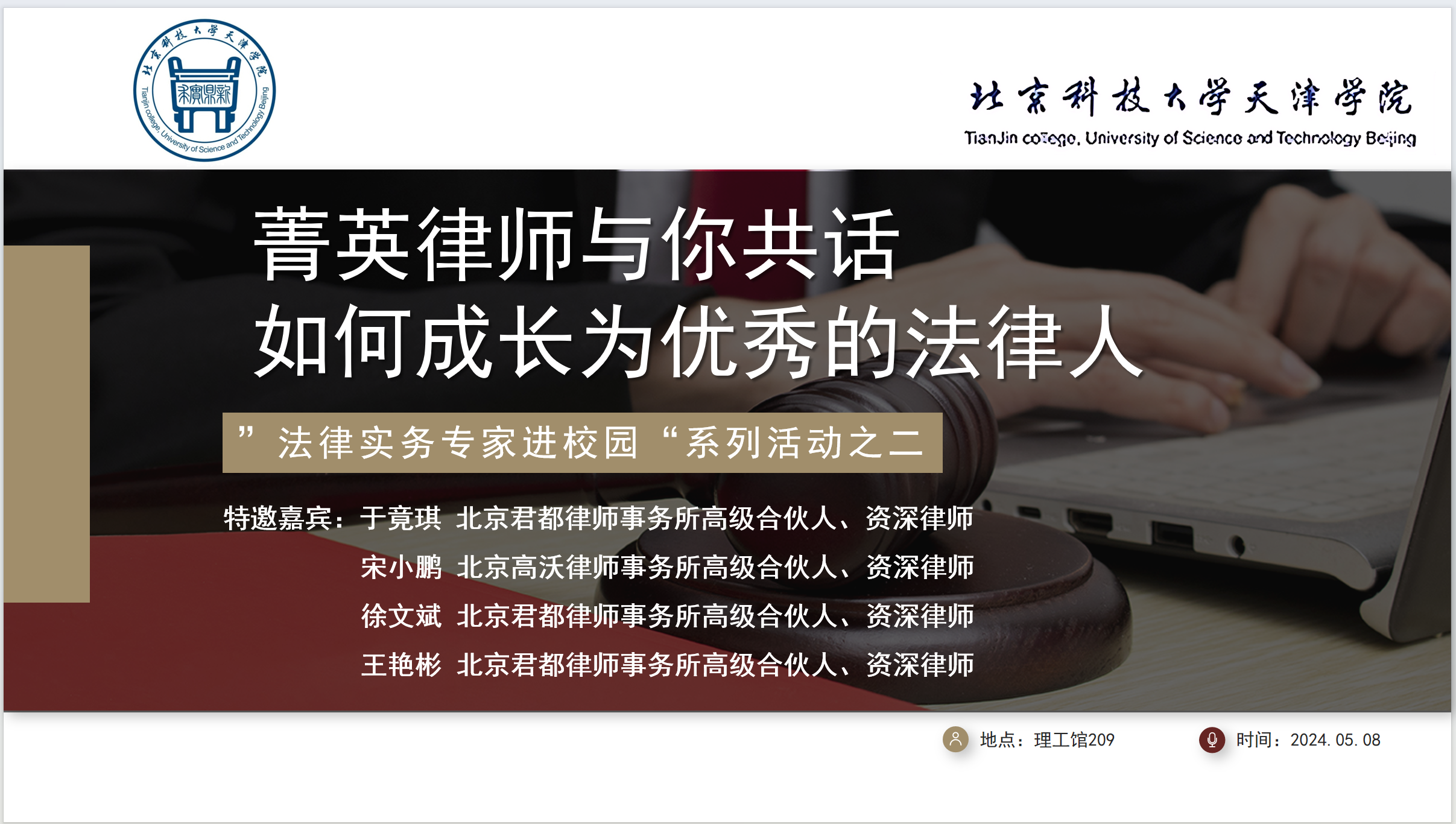 5月8日15时,法律系“法律实务专家进校园”第二期活动在理工图书馆209成功举办。本期活动以“菁英律师与你共话--如何成长为优秀的法律人”为主题,特邀北京君都律师事务所高级合伙人、资深律师、老王论坛 兼职教授于竞琪,...