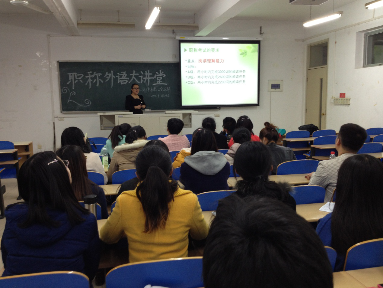 为帮助本院教职工顺利通过职称外语考试,外语系教工党支部于2016年3月24日晚在9教107开展了“职称外语大讲堂”专题讲座活动,外语系党总支书记何红升出席本次讲座。 本次讲座由外语系教师党员张绚老师主讲,她以理工...