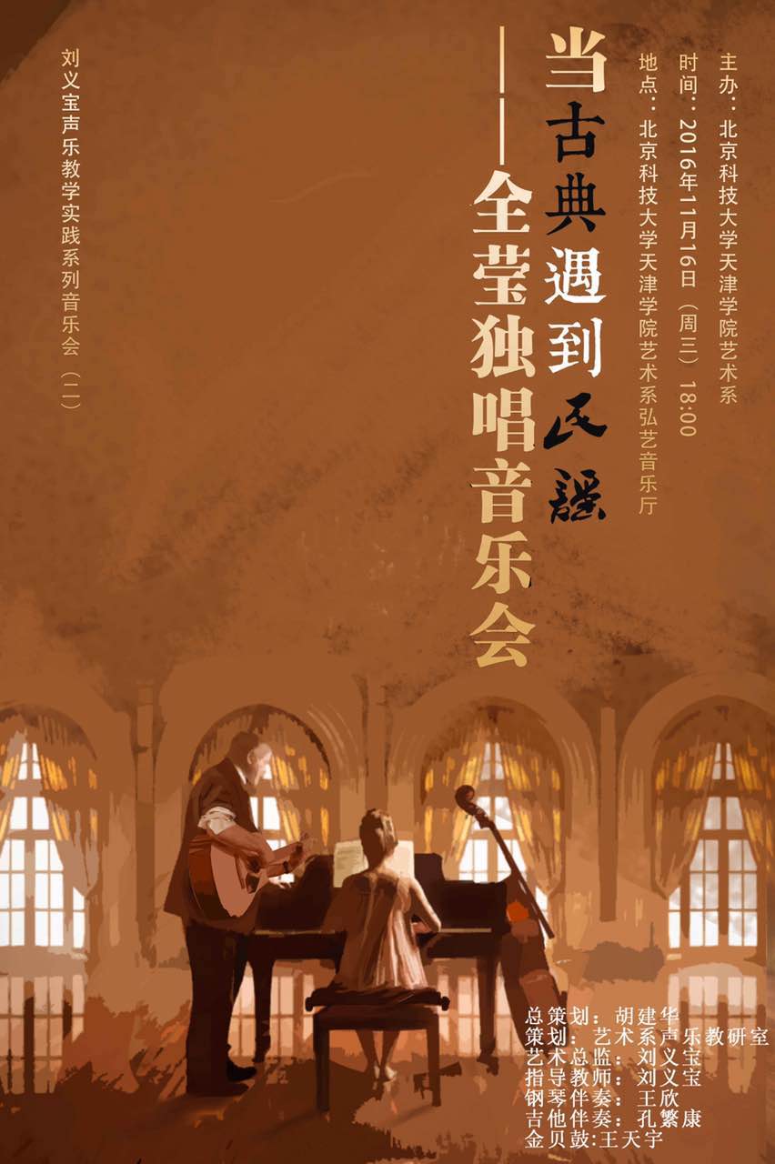 2016年11月16日18:00时,在老王论坛 艺术系弘艺音乐厅,成功举办了由艺术系声乐教师刘义宝指导策划的“当古典遇到民谣——全莹独唱音乐会”刘义宝声乐教学实践系列音乐会(二)。本场音乐会由刘义宝老师...
