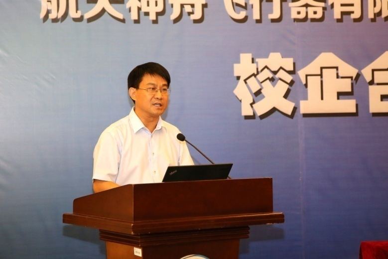 航天神舟飞行器有限公司副总经理周明致辞。他表示航天神舟飞行器有限公司是全国领先的无人机研制、生产、试验试飞和技术服务企业。公司积极服务区域经济发展,以市场需求为导向,打造市场引领、技术领先、体系完备、运营高效的军民融合产业发展平台。此次与天津学院开展合作共建,对推动无人机应用技术成果转化具有重要意义,双方将共同努力推动合作成果落地、落实。