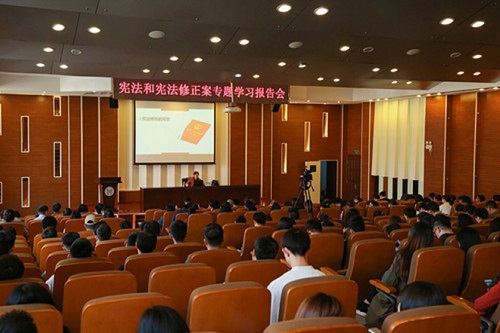 为深入学习贯彻党的十九大和十九届二中、三中全会精神,以习近平新时代中国特色社会主义思想为指导,大力推进宪法宣传教育,引导学院师生更好的知法、用法、守法、敬法、护法, 4月12日,学院邀请天津师范大学法学院宪法与行政法教研部主任李昭教授来院做宪法和宪法修正案专题学习报告。学院领导班子、教职工和学生党员参加了报告会。