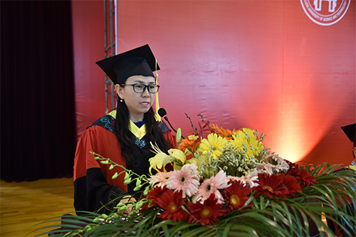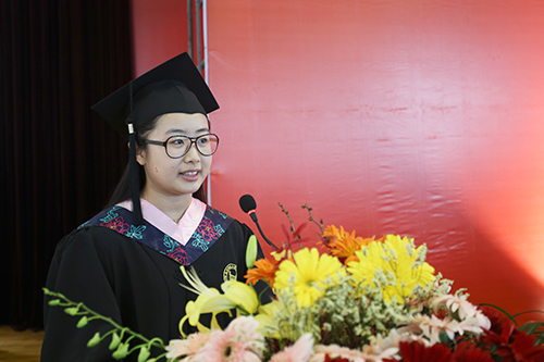 法律系法学1301班的韩雨萌同学代表2017届全体毕业生发言。她向辛勤培育我们的母校和老师们以及支持和鼓励我们的父母致以衷心的感谢!同时所有毕业生同学表示衷心的祝贺和诚挚的祝福。