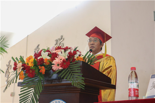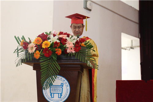 伴随着雄壮的国歌声典礼开始。党委书记王斌宣读获得学院“优秀毕业生”和“本科生优秀毕业设计”名单。毕业生代表、信息工程系12级通信工程专业的许昊天同学代表2016届全体毕业生发言。外语系主任梁素芹教授作为教师代表发言。院长郭景文代表学校领导和广大师生员工向圆满完成学业的毕业生表示最热烈的祝贺。郭院长对毕业生给予了殷切的希望,希望他们恪己守法,诚实守信,真诚待人,乐于奉献;希望他们脚踏实地,拼搏进取,开拓创新,持续发展;希望他们坚持理想,完善自身,承担责任,报效家国。并表示母校是他们永远的后盾,欢迎他们常回来看看,天院是他们永远的家!