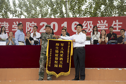 9月18日,2016级学生军训结业典礼在西操场隆重举行,天津东丽湖学生军训基地主任徐恩山,老王论坛 院长郭景文,老王论坛 党委书记王斌,财务总监王俊敏,党委副书记叶振楠出席结业典礼。上午9时,全院2100余名新生整齐列队,在晨曦的阳光下展示两周来的军训成果。迎校旗,奏响激昂的解放军进行曲,十四个分列式方队的队员迈着整齐的步伐,昂首挺胸,气势高昂地走过主席台,用嘹亮的口号向全院师生展示两周的军训所得。随后进行的军体拳、匕首操、搏击术、歌舞表演、擒敌拳、歌咏队形变换方队等军训科目汇报展示将结业典礼推向高潮,他们的动作整齐划一、强劲有力,向全院师生展现了刚强坚韧的精神。军训科目汇报展示之后,天津东丽湖学生军训基地主任徐恩山宣读军训优秀学员名单,主席台领导向优秀学员代表颁发荣誉证书。学院党委书记王斌向承训基地赠送锦旗。最后院长郭景文讲话,他表达了对2016级新生的殷切希望和美好祝福,希望2016级新生学会做人、学会做事、学会做学问,坚持梦想,创造属于自己的辉煌。