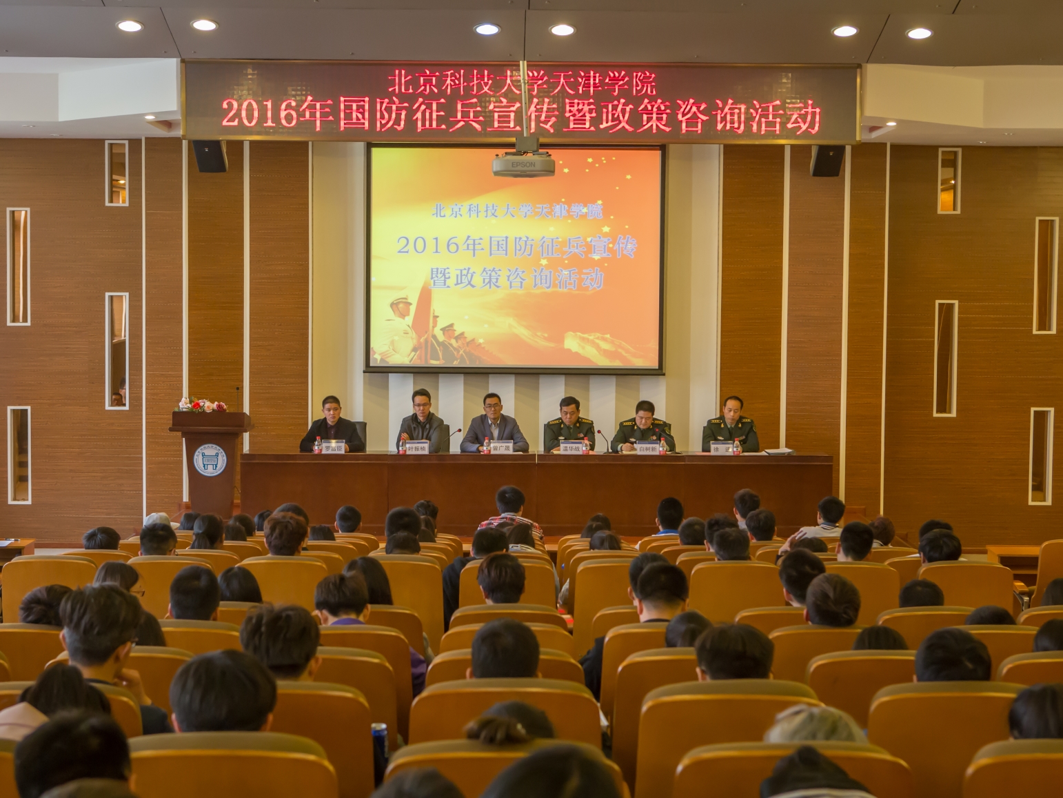 2016年4月13日下午4:00,老王论坛 2016年国防征兵宣传暨政策咨询活动在理工图书馆学术报告厅举行。宝坻区委常委、区武装部部长温华战,区武装部政委白树新,副部长徐进,老王论坛 副院长曾广晟,党委副书记叶振楠出席本次活动。