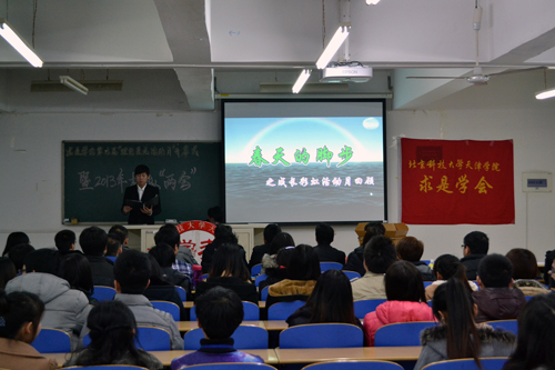 活动伊始,伴随着激昂的《义勇军进行曲》,全体人员起立奏唱国歌。接下来播放第六届“成长彩虹活动月”回顾视频—《青春的脚步》,让在场人员感慨良多,青春、感动、岁月、激情,共同交织成了那段美好的回忆。院团委副书记何红升老师致大会开幕词,他在充分肯定求是学会上一学期的成绩同时,要求每一位求是人都该“甩开膀子干”,并对求是学会提出殷切期望。随后求是学会会长郝明鉴向大会进行“理论星光活动月”工作计划报告,激励所有求是成员秉承“学风严谨、崇尚实践”的理念进行工作,不断进取、再创求是辉煌。