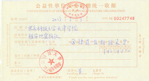 附:北科大财务处接收天津学院师生捐款收据