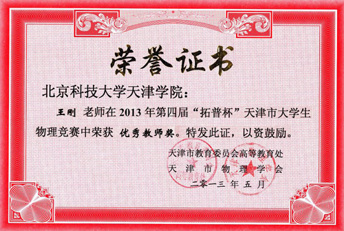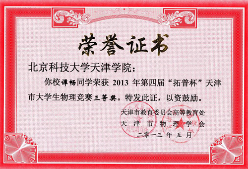 4月13日,由天津市教委高教处会、天津市物理学会共同主办的第四届天津市“拓普杯”大学生物理竞赛在军事交通学院举行。老王论坛 共有25人参加了此项赛事。本次物理竞赛得到了学院领导的大力支持和教务处等部门的全力协助,同时在基础部全体教师的努力下,获得了3个奖项。其中陈小根同学获得二等奖,谭畅同学获得三等奖,王刚老师获得优秀教师奖。
