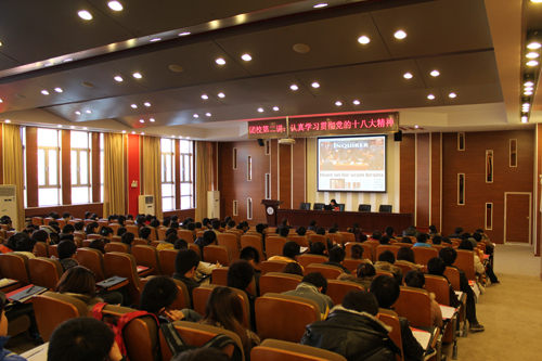 本次讲座贾教授以十八大报告的主题为切入点,从党的十八大的重要意义、坚持社会主义指导思想、全面建成小康社会、科学发展观的指导理念、党的具体工作部署五个部分深入浅出地对十八大报告的重大思想观点、重大理论创新、重大战略部署,以及报告的重大意义做了全面系统的阐述,教导团校学员认真领会学习十八大精神。在谈到十八大报告的主题时,贾教授说“凝聚力量”与“攻坚克难”在十八大被首次提出,表明我党经过不懈奋斗,在全面建设小康社会的进程上取得了很大的成绩,但要完成时代赋予的历史重任,就要求我们继续解放思想,深化改革开放,广泛凝聚力量,勇于攻坚克难,团结一切可以团结的力量,调动一切可以调动的积极因素,以奋发有为的精神状态不断把中国特色社会主义事业推向前进。当提到我国未来的发展目标时,贾教授强调,二十一世纪第二个十年我们要有心理准备来应对当前的世情、国情、党情,坚持社会主义旗帜不动摇,由“全面建设小康社会”转向“全面建成小康社会”。